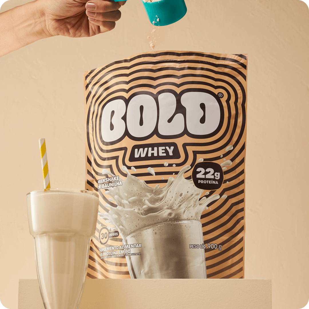BOLD Whey de Milkshake de Baunilha é o nosso coringa. Ele combina com qualquer receita e cai bem em todo paladar. Ideal para quem gosta de sabores mais suaves e discretos. São 22g de proteína na dose de 30g.Embalagem de 450g.- R$ 135