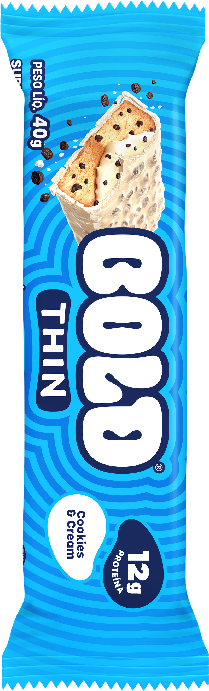 CONHECERA BOLD Thin de Cookies & Cream foi feita para os amantes de chocolate branco. Ela tem um recheio de ganache branco com cobertura de chocolate e crispies proteicos (é muito sabor!).