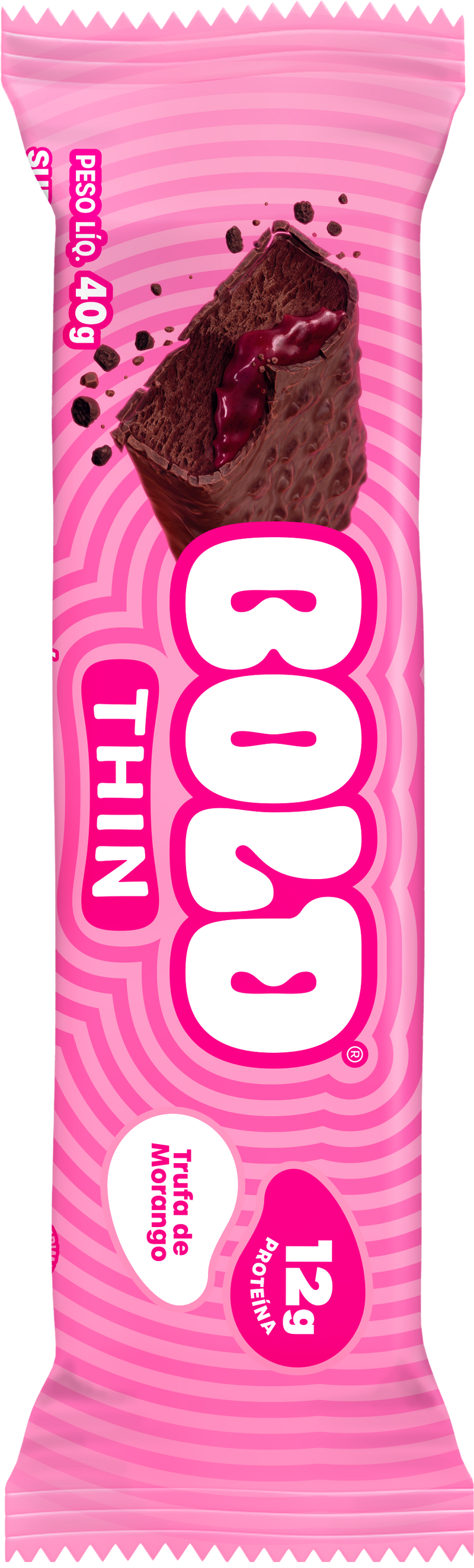 CONHECERA BOLD Thin de Trufa de Morango foi criada para provar que esse doce pode sim ser saudável! A combinação perfeita de chocolate meio amargo com recheio de morango, crispies e cobertura de chocolate ao leite.