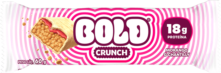 Nossa nova linha de barras de proteína é incrivelmente crocante! A BOLD Crunch de Morango & Chantilly têm recheio irresistível de crispies proteicos e morango, coberta com chocolate branco.