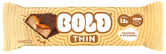A BOLD Thin de Caramelo & Amendoim contém um recheio de caramelo diet delicioso, pedaços de amendoim e cobertura de chocolate ao leite (uma das favoritas de nossos clientes).