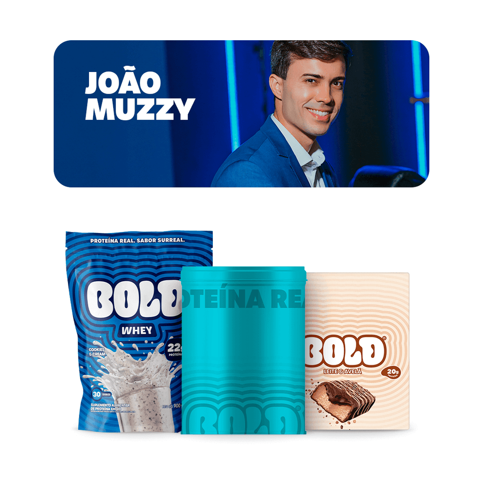 Inspirado pelo nutricionista João Muzzy, esse combo traz o BOLD Whey Cookies & Cream (900g) e a barra de proteína BOLD Leite & Avelã.
